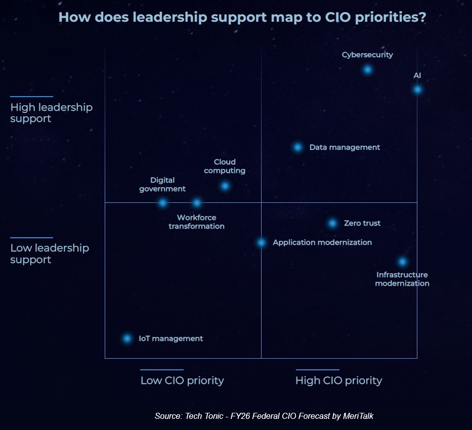 Artificial intelligence (AI) is the top priority for 2026 in federal technology circles. That’s the main finding in a new report – Tech Tonic: FY26 Federal CIO Forecast – by MeriTalk.
